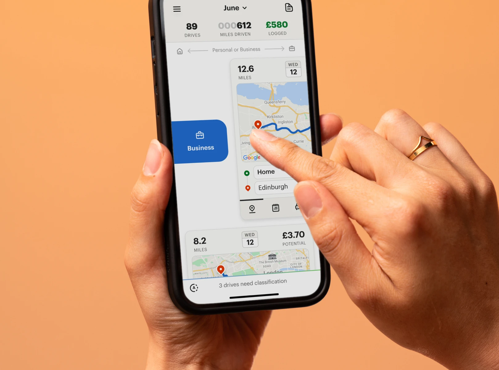 MileIQ tracks your miles for you. All you have to do is swipe left or right to classify your drive, and then tap to submit your tax-compliant mileage report.